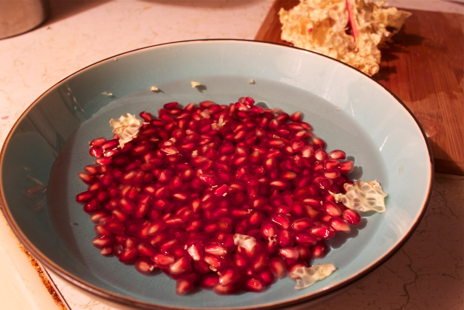 You’ll want to get a bowl of water and, very gently, break off the arils with your fingers and let them fall into the water. Any white flesh that falls will float to the top of the water, making it very easy to pick out at the end.