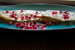 If you’re willing to deal with a potential mess in the frying pan, start by laying thin slices of the gouda cheese over half the tortilla. Press the pomegranate arils gently into the cheese (it helps if the cheese is at room temperature at this point instead of coming directly from the fridge).